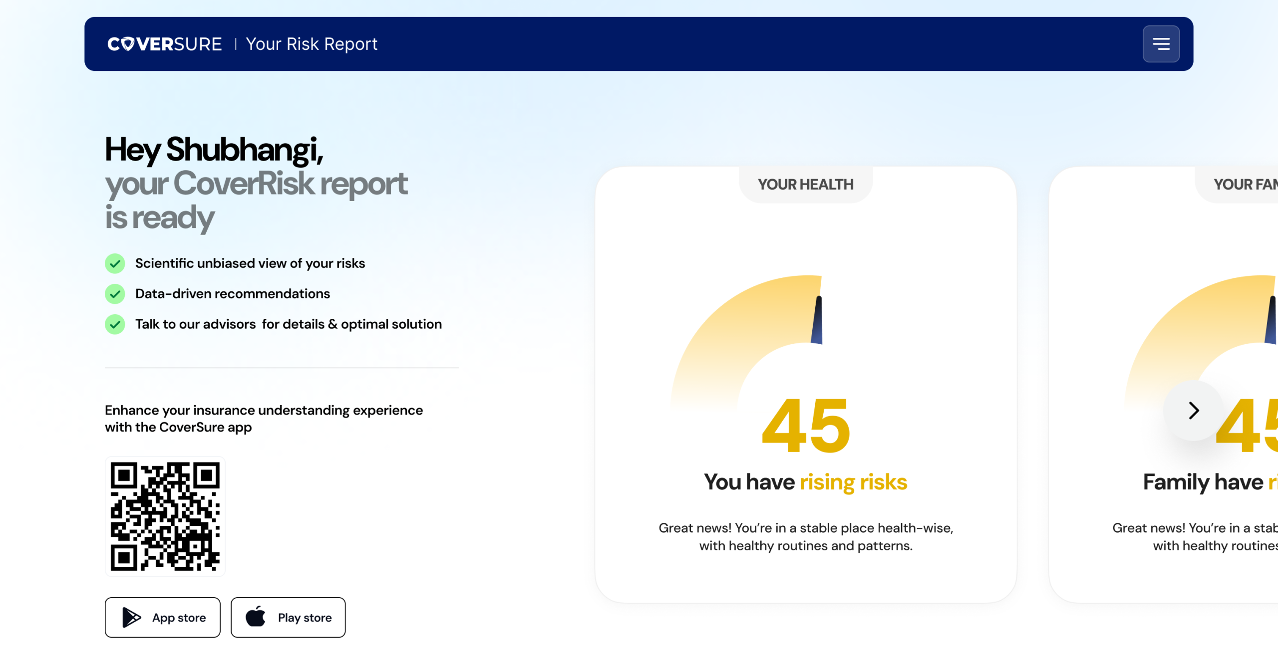 The CoverRisk Calculator breaks down your risk score, showing what’s behind it and how every detail shapes your insurance recommendation.